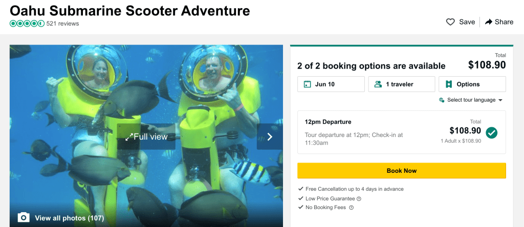 After we arrive you have 2 choices. We can go on submarine scooter adventure, and tour underwater and see any type of marine animals. We can’t promise you that you’ll find animals you want, I can promise you that adventure with us will be the best experience. All the equipments are free to borrow from us. No cancellation fees up to 4 days notice, no booking fees!