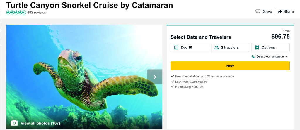 Second option is turtle canyon snorkel. We guarantee that you will have great memories with us. Equipments are $10 to rent, and you need to spend 30 minutes with us to learn how to breath in snorkel with mouth. It’s very dangerous if you breath with your nose when you’re in the water, you’ll start panicking. To prevent we surely teach you what to do. You can have a great memories with under $100!