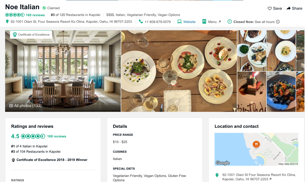If you’re vegetarian, and allergic to seafoods, here’s the best choice you can make. It’s called Noe Italian, as you noticed from the name it’s Italian food. prices are very friendly from $10 up to $25. They have very nice view, and tables for large groups.